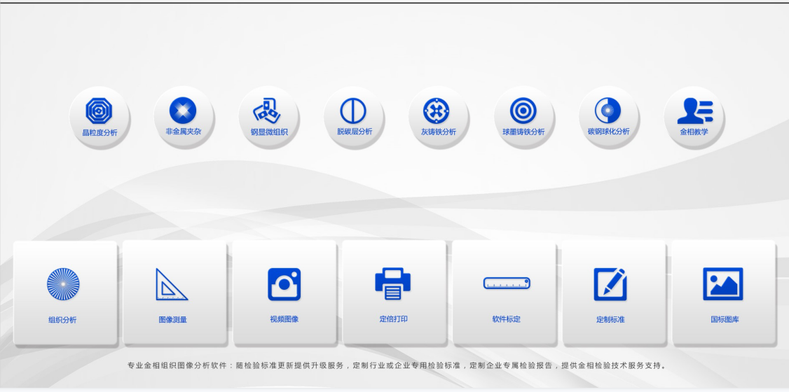 (4)、7大檢驗(yàn)類別快速入口:統(tǒng)計(jì)制作7大類別快速入口:晶粒度、非金屬夾雜、鋼的顯微組織、脫碳層分析、灰鐵、球鐵、碳鋼球化等,外加一個(gè)金相教學(xué)。