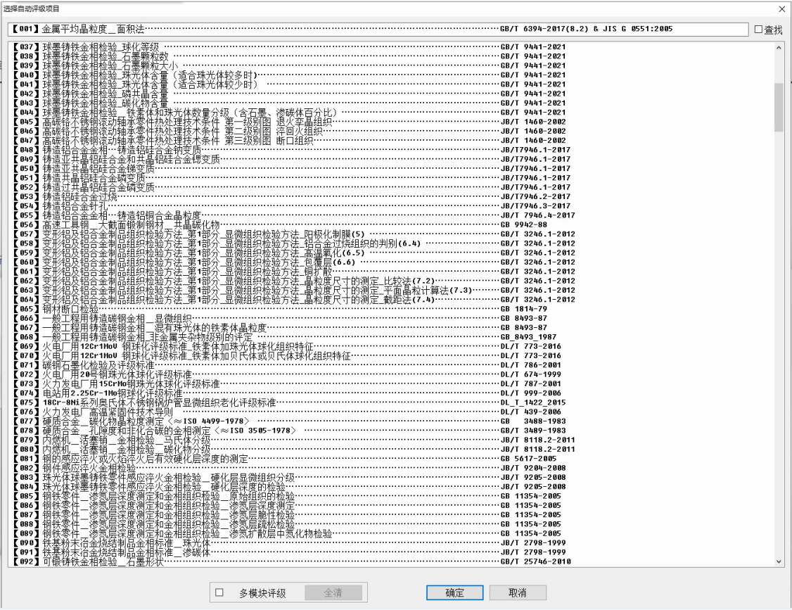 FMIA金相圖像分析軟件標(biāo)準(zhǔn):國(guó)標(biāo)庫(kù)包含了150個(gè)類別約700個(gè)常用子模塊,基本上覆蓋了常用的金相標(biāo)準(zhǔn),適應(yīng)絕大多數(shù)單位金相分析和檢驗(yàn)的要求;軟件隨機(jī)發(fā)行約120個(gè)常用子模塊,其他均是終生免費(fèi)升級(jí)調(diào)用。