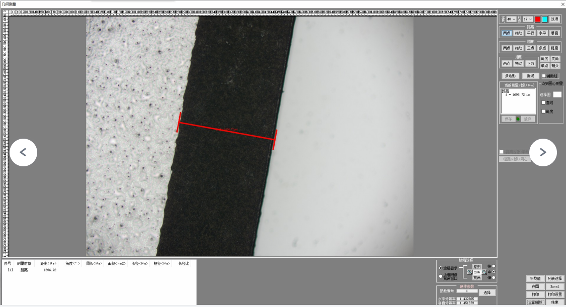 2、圖像測(cè)量:軟件提供了距離、矩形、圓形、多邊形、折線長(zhǎng)度、角度、直線夾角、弧度,點(diǎn)到圓心測(cè)量等多種測(cè)量工具,來(lái)滿足用戶的基本幾何測(cè)量功能,得到相關(guān)測(cè)量數(shù)據(jù)。