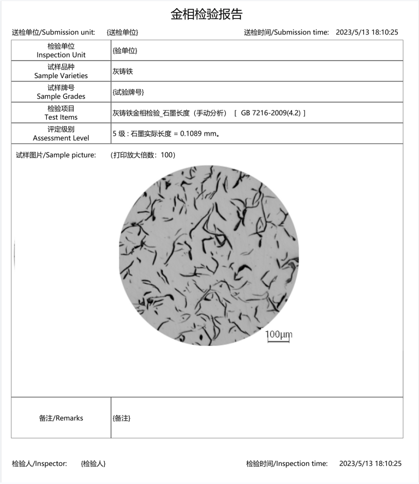 (1)、自動(dòng)評(píng)級(jí):在金相標(biāo)準(zhǔn)中有定量標(biāo)準(zhǔn)的(比如計(jì)算公式,百分比范圍等),軟件自動(dòng)評(píng)級(jí),給出金相級(jí)別,生成金相檢測(cè)報(bào)告。