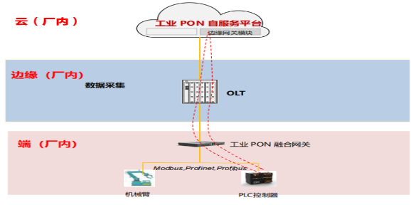 工業(yè)PON融合網(wǎng)關(guān)向下支持多種端側(cè)的工業(yè)設(shè)備(含機(jī)械臂)和PLC控制器的接入和數(shù)采,同時支持多種主流PLC協(xié)議;向上連接OLT,提高響應(yīng)速度和數(shù)據(jù)安全性;最終將數(shù)據(jù)傳送至工業(yè)PON自服務(wù)平臺,在云端完成數(shù)據(jù)匯聚,實(shí)現(xiàn)邊緣數(shù)采、工業(yè)視覺檢測、邊云協(xié)同應(yīng)用等功能。