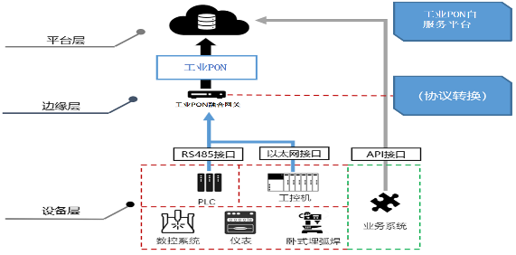 以物聯(lián)網(wǎng)、設(shè)備數(shù)據(jù)采集和邊緣計算為技術(shù)基礎(chǔ),通過工業(yè)PON融合網(wǎng)關(guān)對現(xiàn)場設(shè)備進(jìn)行連接,通過數(shù)采協(xié)議將設(shè)備的運(yùn)行狀態(tài)、工藝參數(shù)等數(shù)據(jù)實(shí)時上傳給控制系統(tǒng),實(shí)現(xiàn)設(shè)備狀態(tài)、參數(shù)等動態(tài)數(shù)據(jù)的全面感知與數(shù)據(jù)匯聚。
