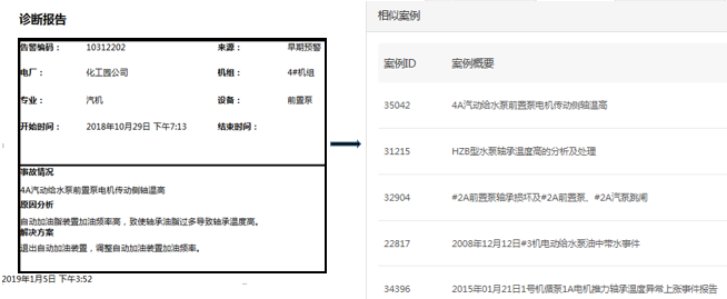 南京化學(xué)工業(yè)園熱電有限公司2018年10月29日從預(yù)警系統(tǒng)推送至診斷系統(tǒng)一條告警信息:“前置泵電機軸承溫度高”,診斷系統(tǒng)根據(jù)告警信息推薦的案例中詳細(xì)介紹了前置泵電機軸承溫度高的主要原因與處理方法,用戶參考推薦案例,判斷軸承溫度高的原因為潤滑油過量,通過調(diào)整自動加油裝置的加油頻率解決了該問題,而這一案例也作為新的案例進(jìn)入了知識庫,當(dāng)該問題再次發(fā)生時,診斷系統(tǒng)會立即推送該案例給用戶,起到知識傳承的作用,診斷過程參見圖16。