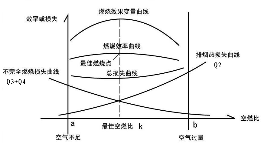 在鍋爐熱效率損失中,主要因素包括:排出煙氣所帶走的熱量、化學(xué)不完全燃燒熱損失、機(jī)械不完全燃燒熱損失,見(jiàn)下圖通用燃燒曲線: