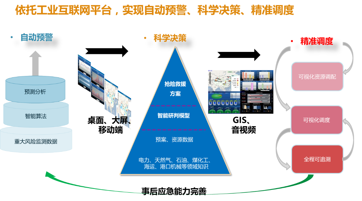 項(xiàng)目建成了覆蓋集團(tuán)各層級(jí)、全產(chǎn)業(yè)的應(yīng)急管理、指揮體系,實(shí)現(xiàn)涵蓋突發(fā)事件的預(yù)防、準(zhǔn)備、響應(yīng)、恢復(fù)的整個(gè)全流程的應(yīng)急管理系統(tǒng)。以大數(shù)據(jù)驅(qū)動(dòng)的工業(yè)互聯(lián)網(wǎng)平臺(tái)為支撐,利用其豐富的智能算法,實(shí)現(xiàn)各類重大風(fēng)險(xiǎn)的預(yù)測(cè)預(yù)警,并以桌面、大屏、移動(dòng)端等多種告警方式及時(shí)、自動(dòng)通知到各級(jí)調(diào)度中心領(lǐng)導(dǎo)和應(yīng)急值守人員;基于應(yīng)急預(yù)案和各類應(yīng)急資源數(shù)據(jù),結(jié)合產(chǎn)業(yè)領(lǐng)域知識(shí),建立智能研判模型,提供搶險(xiǎn)救援方案以支撐應(yīng)急指揮決策;實(shí)現(xiàn)了GIS、音視頻等多媒體手段,來(lái)提供可視化的應(yīng)急資源調(diào)配、應(yīng)急響應(yīng)調(diào)度和全程可追溯;并通過(guò)應(yīng)急恢復(fù)階段的評(píng)估分析、案例歸檔來(lái)完善應(yīng)急管理體系。因此,通過(guò)應(yīng)急指揮系統(tǒng),建立起涵蓋從監(jiān)測(cè)預(yù)警到研判、響應(yīng)、總結(jié)的閉環(huán)的應(yīng)急能力建設(shè)體系。