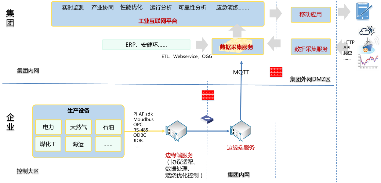 在集團(tuán)工業(yè)互聯(lián)網(wǎng)平臺(tái)中,部署數(shù)據(jù)采集服務(wù),接入內(nèi)網(wǎng)的ERP、安健環(huán)等經(jīng)營(yíng)管理類數(shù)據(jù),接入通過(guò)單向隔離網(wǎng)閘擺渡的生產(chǎn)實(shí)時(shí)數(shù)據(jù)和外部數(shù)據(jù)。通過(guò)企業(yè)端部署的邊緣端服務(wù)安全地采集生產(chǎn)實(shí)時(shí)數(shù)據(jù);通過(guò)外網(wǎng)DMZ部署的數(shù)據(jù)采集服務(wù),安全接入外部的氣象、船舶AIS、煤炭?jī)r(jià)格指數(shù)等數(shù)據(jù)。