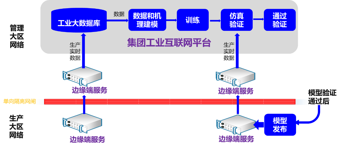 邊緣端服務(wù)負(fù)責(zé)采集生產(chǎn)實(shí)時(shí)數(shù)據(jù)(負(fù)荷、給煤量、主蒸汽壓力等),并通過(guò)單向隔離網(wǎng)閘接入數(shù)據(jù)到集團(tuán)工業(yè)互聯(lián)網(wǎng)平臺(tái)。在集團(tuán)工業(yè)互聯(lián)網(wǎng)平臺(tái)端,基于歷史和新增生產(chǎn)實(shí)時(shí)數(shù)據(jù)進(jìn)行建模和訓(xùn)練;并通過(guò)仿真手段,與實(shí)時(shí)數(shù)據(jù)進(jìn)行比較驗(yàn)證。一致時(shí),表示通過(guò)驗(yàn)證。