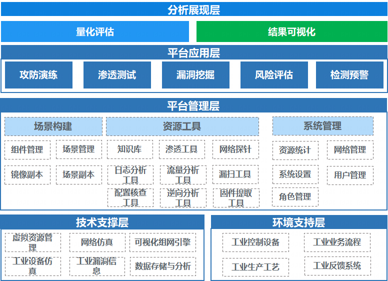 技術(shù)支撐層具備接入各類軟硬件資源、網(wǎng)絡(luò)仿真、可視化組網(wǎng)引擎等能力,為平臺提供基礎(chǔ)技術(shù)支撐;平臺管理層通過對鏡像、組件的接入,構(gòu)建核心資源,提供對平臺本身的運營管理支撐,包括用戶管理、角色與權(quán)限管理等,同時提供應(yīng)用層通用的資源庫,如各類安全工具、知識庫、數(shù)據(jù)采集工具等;平臺應(yīng)用層是根據(jù)工業(yè)企業(yè)典型使用場景和業(yè)務(wù)流程,支撐攻防演練、滲透測試、漏洞挖掘、風(fēng)險評估和檢測預(yù)警。