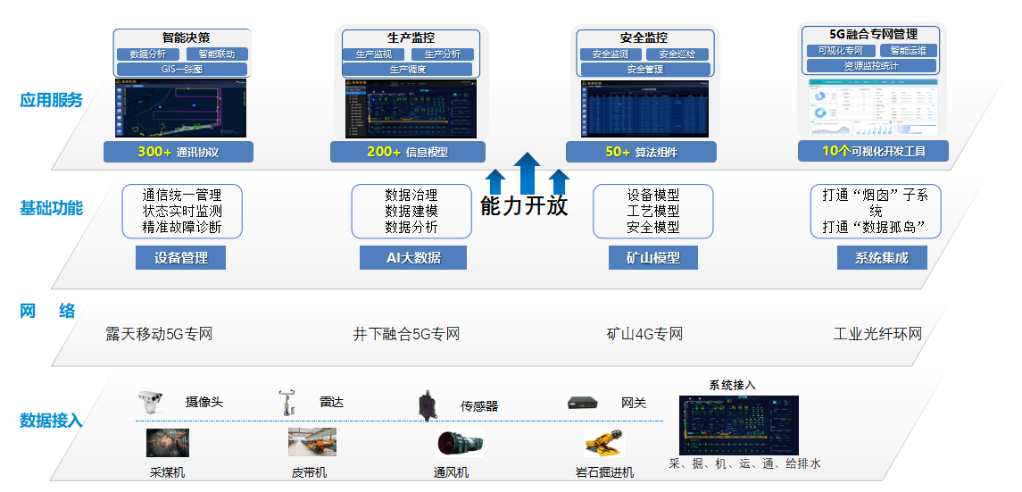 智慧礦山是基于現(xiàn)代智能化理念,將工業(yè)互聯(lián)網(wǎng)、云計算、大數(shù)據(jù)等與現(xiàn)代礦山開發(fā)技術(shù)深度融合,形成礦山全面感知、實時互聯(lián)、分析決策、自主學(xué)習(xí)、動態(tài)預(yù)測、協(xié)同控制的完整智能系統(tǒng),實現(xiàn)礦井開拓、采掘、運通、分選、安全保障、生態(tài)保護、生產(chǎn)管理等全過程的智能化運行。5G網(wǎng)絡(luò)以其大帶寬、低時延、廣連接的特性與礦山領(lǐng)域數(shù)據(jù)采集及智能控制的場景契合度非常高,是打造智慧礦山的基礎(chǔ)條件。中移(上海)產(chǎn)業(yè)研究院基于自身技術(shù)創(chuàng)新能力及行業(yè)經(jīng)驗積累,自主研發(fā)智慧礦山融合管控平臺(中國移動礦山工業(yè)互聯(lián)網(wǎng)平臺),平臺打造智慧決策、生產(chǎn)管理、安全管理、移動應(yīng)用等功能模塊,打通專業(yè)子系統(tǒng)之間的數(shù)據(jù)通道,為行業(yè)客戶實現(xiàn)綜合管控、數(shù)字化運維提供使能。同時結(jié)合5G技術(shù)優(yōu)勢,為行業(yè)客戶提供端到端一體化智慧礦山服務(wù)。