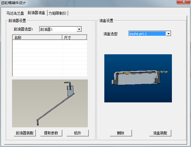 在選型界面可選擇需要的齒輪罩類型,類型可擴(kuò)展。可通過“提取參數(shù)”功能,將當(dāng)前模型中的數(shù)據(jù)提取到尺寸設(shè)計(jì)表中,可自定義相關(guān)尺寸,點(diǎn)擊“修改”可將當(dāng)前值傳遞到模型。