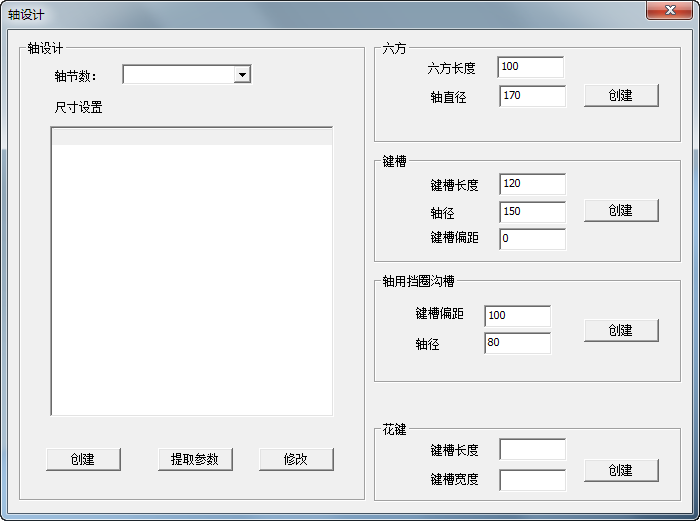 在軸設(shè)計(jì)界面,可以自定義一根軸,同時(shí)可以定義軸上的相關(guān)特征,如六方、鍵槽、軸用擋圈槽以及花鍵等,軸設(shè)計(jì)界面如下: