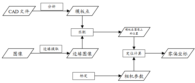 系統處理流程如上圖所示,是圖像處理的核心部分,除此之外,產品主體結構還包括CNC交互部分,用于處理NC代碼的調用,并將結果反饋給CNC,用于工件加工。