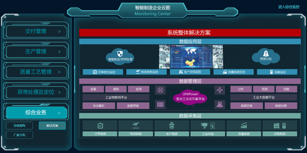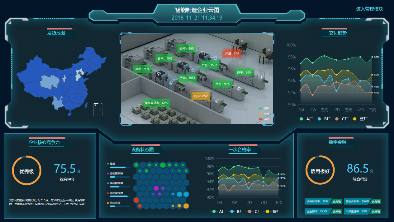 建立智能制造企業(yè)云圖,與現(xiàn)有業(yè)務系統(tǒng)集成,作為信息化,智能化的一個重要組成部分,負責公司各系統(tǒng)關鍵數(shù)據(jù)采集、匯總、分析處理,并以圖形化,虛擬加實景形態(tài)展現(xiàn),以達到透明化管理、調(diào)度、控制、優(yōu)化的目的。將有利于公司全價值鏈信息暢通,提高設備利用率和生產(chǎn)力,降低能耗,提升綜合競爭力。