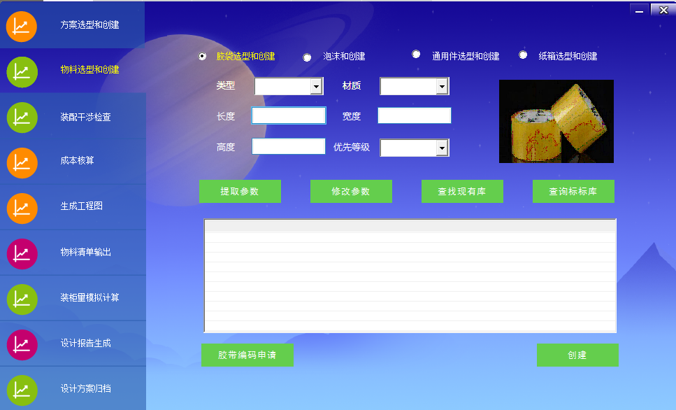 第二步:APP根據(jù)產(chǎn)品包裝方案自動進(jìn)行詳細(xì)物料設(shè)計,工程師可以對物料尺寸進(jìn)行修改,通過相似性識別技術(shù),對物料中能夠借用已有物料的自動進(jìn)行替換,無法借用的,工程師通過APP進(jìn)行編碼申請,自動創(chuàng)建新的物料進(jìn)行使用。