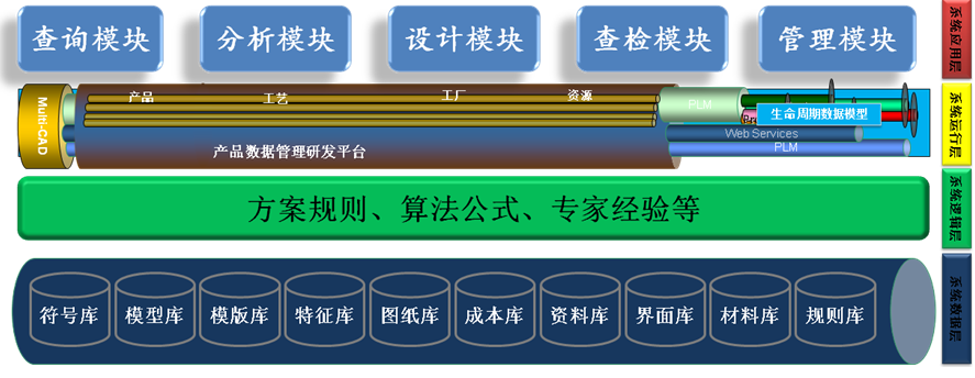 包裝智能設(shè)計APP主要包含選型、設(shè)計、檢查、分析、管理五大模塊,對應(yīng)了產(chǎn)品設(shè)計的全流程,可以服務(wù)于整個產(chǎn)品的研發(fā)過程,系統(tǒng)架構(gòu)如下圖所示: