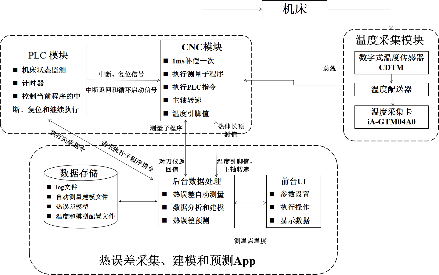 熱誤差測量和補償系統目前針對的是M1.4主軸Z向的熱伸長檢測和補償,包括硬件和軟件(App)兩部分組成。硬件部分包括對刀儀和自主研發的溫度采集裝置,其中對刀儀用于自動采集主軸熱伸長量;溫度采集裝置包括溫度傳感器、溫度配送器和采集卡,采集主軸測溫點的溫度和環境溫度,通過總線的方式傳輸給CNC,熱伸長測量和補償模塊讀取CNC里面的參數值即可獲得溫度值,分別用于建立熱誤差模型和后續的熱伸長量的建立。