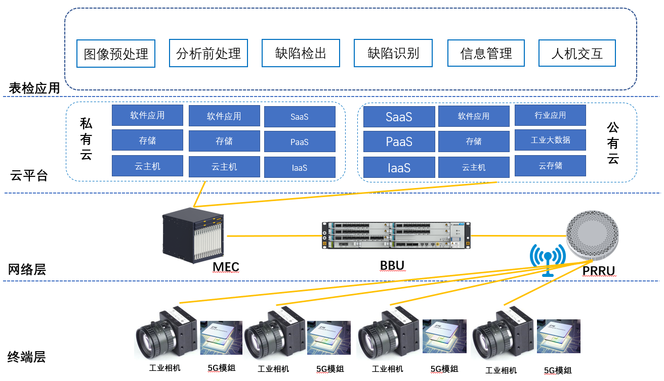 本項目既支持公有云部署又支持私有云部署,滿足工業企業絕大部分場景需求。無線網絡實施快速,生產線停機時間短。采用5G網絡部署機器視覺表檢系統,生產線發生移位、生產工序發生變化時,網絡很容易調整到位,實現柔性制造。