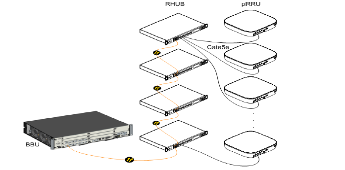 系統組網連接如上圖所示。RHUB使用光電復合纜連接遠端單元RRU,RRU含內置天線實現5G信號覆蓋。