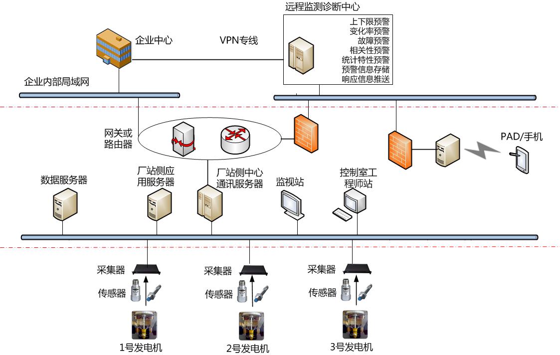 1)感知層:數據采集、故障預警指標計算提取。由傳感器、變送器、智能采集/指標計算裝置等智能采集組成。設備各部位的傳感器將各種物理信號轉化為電信號,傳送到智能采集器及特征指標計算裝置,智能特征指標計算裝置將這些信號采集和處理提取,得到反映機組運行狀態和故障的各種特征指標等,統一存儲到廠站側局域網數據服務器。