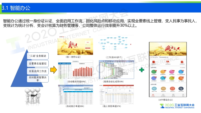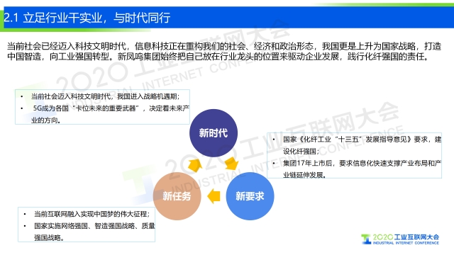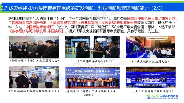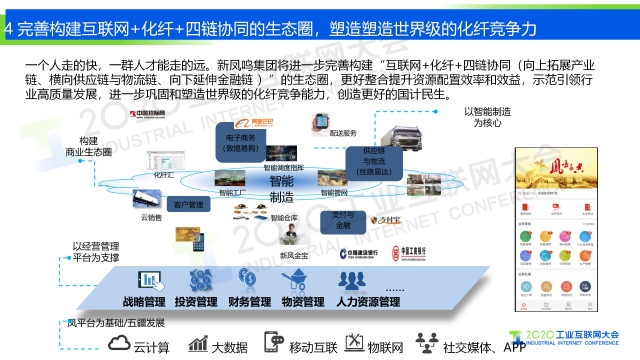 專家說 “在5G的加持下,新鳳鳴構(gòu)建了集成基礎(chǔ)數(shù)據(jù)、實(shí)時(shí)數(shù)據(jù)、ERP、MES、大數(shù)據(jù)及商務(wù)智能、APP和標(biāo)識(shí)解析于一體的工業(yè)互聯(lián)網(wǎng)平臺(tái),形成智能+辦公、智能+物流、智能+銷售、智能+決策、智能+生產(chǎn)、智能+運(yùn)營(yíng)的十大應(yīng)用,一體化打通集團(tuán)的業(yè)務(wù)鏈、數(shù)據(jù)鏈和決策鏈,實(shí)現(xiàn)與內(nèi)外部的互聯(lián)互通,支撐企業(yè)向上拓展產(chǎn)業(yè)鏈,橫向打通供應(yīng)與物流鏈,向下延伸金融與服務(wù)鏈,用平臺(tái)的先進(jìn)性支撐和保持我們企業(yè)高速發(fā)展、創(chuàng)新發(fā)展、高質(zhì)量發(fā)展。” 以下是演講PPT 敬請(qǐng)閱讀