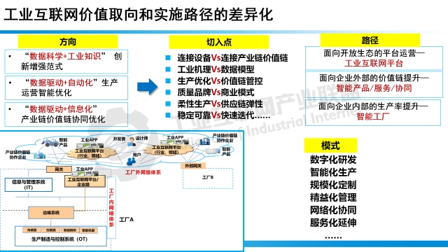在談及“工業(yè)互聯(lián)網(wǎng)價值取向和實施路徑的差異化”時,余曉暉表示工業(yè)互聯(lián)網(wǎng)一定是數(shù)據(jù)驅(qū)動的,但又不只是數(shù)據(jù)驅(qū)動,它會和工業(yè)、行業(yè)本身結(jié)合。有三個方面,第一是“數(shù)據(jù)科學(xué)+工業(yè)知識” 創(chuàng)新增強(qiáng)范式,第二是“數(shù)據(jù)驅(qū)動+自動化”生產(chǎn)運營智能優(yōu)化,第三是“數(shù)據(jù)驅(qū)動+信息化”產(chǎn)業(yè)鏈價值鏈協(xié)同優(yōu)化,這也是工業(yè)互聯(lián)網(wǎng)現(xiàn)在的價值所在,把傳統(tǒng)工業(yè)已有的體系做更好的結(jié)合,形成新的變革模式。