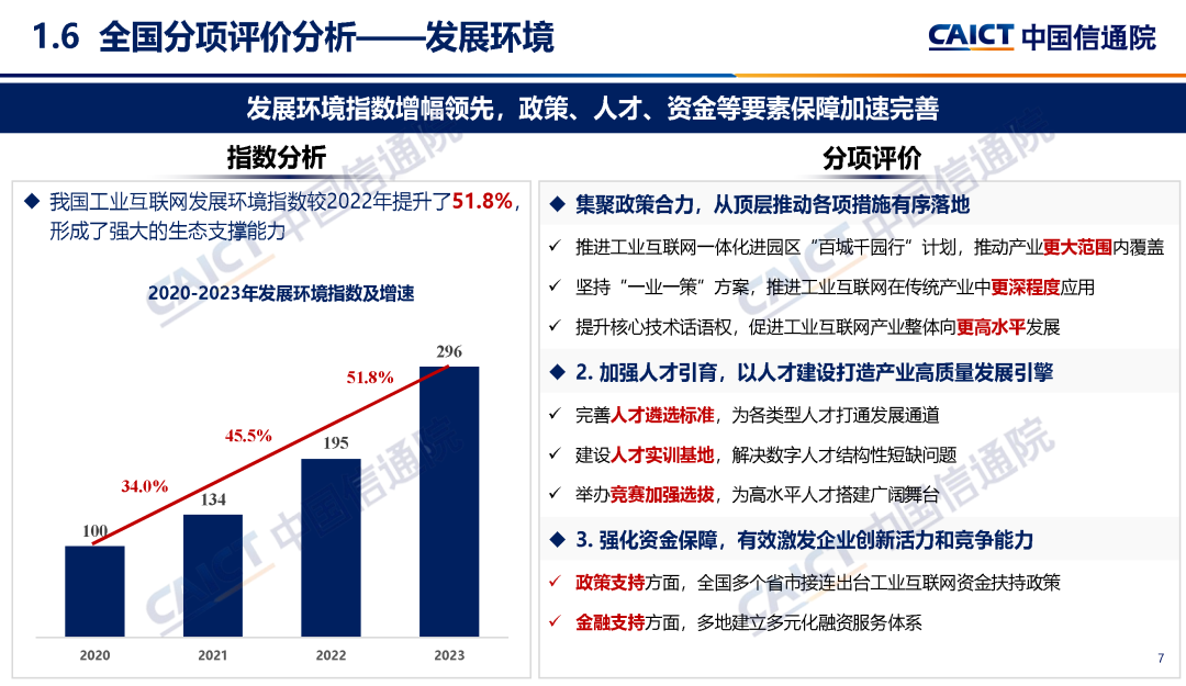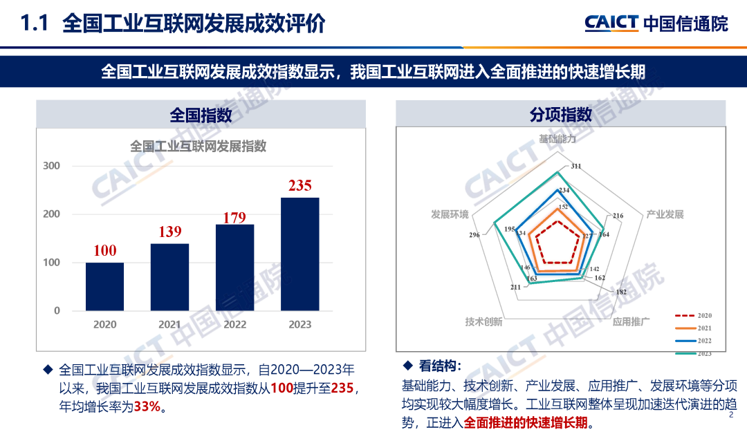 1. 全國工業(yè)互聯(lián)網發(fā)展成效指數顯示,我國工業(yè)互聯(lián)網進入全面推進的快速增長期。基礎能力指數連續(xù)三年高速增長,從“規(guī)模擴張”向“質量提升、結構優(yōu)化、功能升級”轉變;技術創(chuàng)新指數穩(wěn)步提升,新領域創(chuàng)新突破助力“換道超車”;產業(yè)發(fā)展指數增長提速,產業(yè)從舊到新、從小到大、從弱到強邁進;應用推廣指數穩(wěn)定增長,由“全面探索”轉向“場景推廣、鏈式轉型”;發(fā)展環(huán)境指數增幅領先,政策、人才、資金等要素保障加速完善。