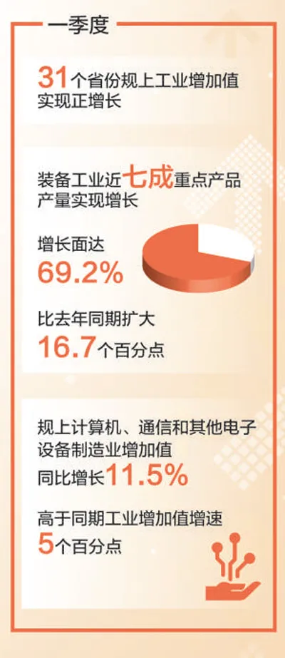 開局穩,增速只是其一,還要看結構。產業結構持續優化,一季度,裝備制造業、高技術制造業增加值占規上工業的比重分別提高了1.9個、0.5個百分點。企業轉型發展提速,食品、化工、有色金屬等行業技術改造投資實現了兩位數增幅。經營主體持續壯大,截至2月底,規模以上工業企業戶數較上年底增加0.7萬戶。