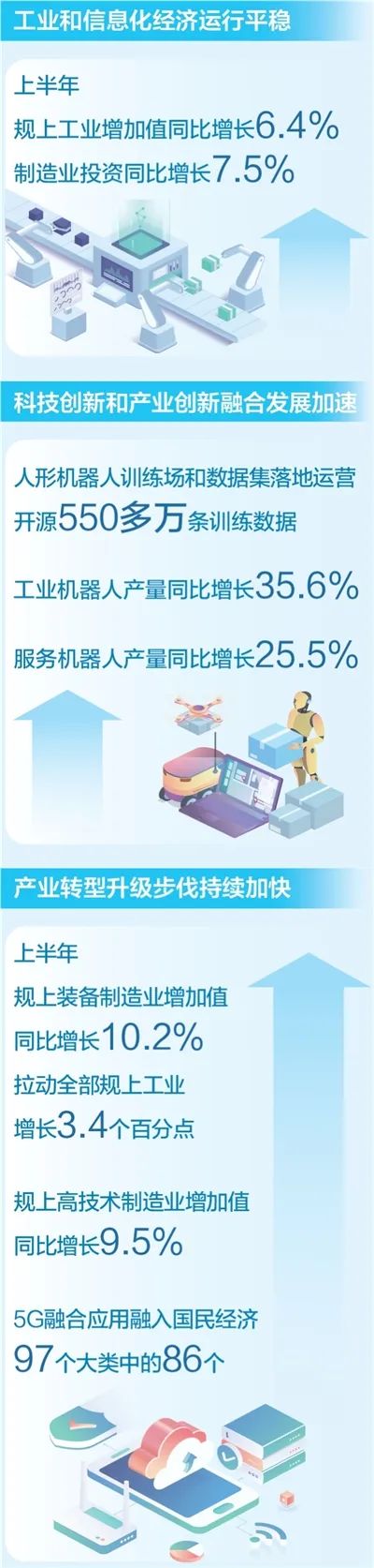 “上半年規模以上工業增加值同比增長6.4%,在一季度良好開局的基礎上展現較強韌性,制造業增加值占GDP比重25.7%,基本保持穩定?!敝x少鋒表示,今年以來,工業和信息化部深入落實穩就業穩經濟、“兩重”“兩新”等政策措施,充分發揮我國工業經濟基礎強、韌性強、創新活躍的優勢,實現工業經濟平穩運行。