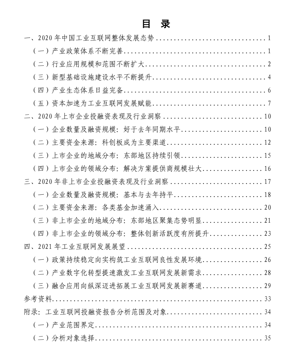 通過對一百六十家上市企業和四百余家非上市企業投融資活動的分析,報告發現:我國工業互聯網整體發展處于快速上升期,社會各界已達成廣泛共識,各方加速布局工業互聯網領域,形成了以資本為主要投入要素、多方主體共同參與、多措并舉加速賦能的投融資發展實踐模式。整體看,2020年,我國工業互聯網領域的投融資活動保持較高水平的活躍程度。上市企業方面,受疫情沖擊影響并不明顯,融資數量和規模實現雙增長,解決方案提供商的規模快速壯大,科創板成為主要的融資渠道,企業海外融資也實現新突破,東部地區繼續發揮工業互聯網引領作用。非上市企業方面,上半年受影響較大,下半年活躍度逐步回升,各類資本持續積極布局,整體的創業創新活動逐漸步入了較為平穩的發展階段,資金向更為成熟的企業聚集,各地區創投重點方向出現分化,短板領域創投活躍度有所提升。