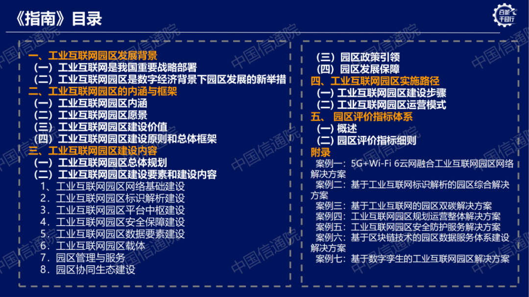 中國信通院總工程師敖立對指南(2.0版本)進行了詳細解讀。他指出指南(2.0版本)整體包括發(fā)展背景、內(nèi)涵框架、建設(shè)內(nèi)容、實施路徑和評價指標(biāo)五個部分。圍繞數(shù)字經(jīng)濟、綠色低碳、中小企業(yè)特色產(chǎn)業(yè)集群等最新相關(guān)政策,更新了工業(yè)互聯(lián)網(wǎng)園區(qū)的最新發(fā)展背景、內(nèi)涵與框架,細化了標(biāo)識、數(shù)據(jù)等園區(qū)建設(shè)內(nèi)容,增加了線上線下一體化的園區(qū)新運營模式總結(jié),并相應(yīng)的對評價指標(biāo)體系進行了優(yōu)化調(diào)整。同時,結(jié)合工業(yè)互聯(lián)網(wǎng)園區(qū)近幾年的發(fā)展態(tài)勢,節(jié)選部分優(yōu)秀案例,以饗讀者。