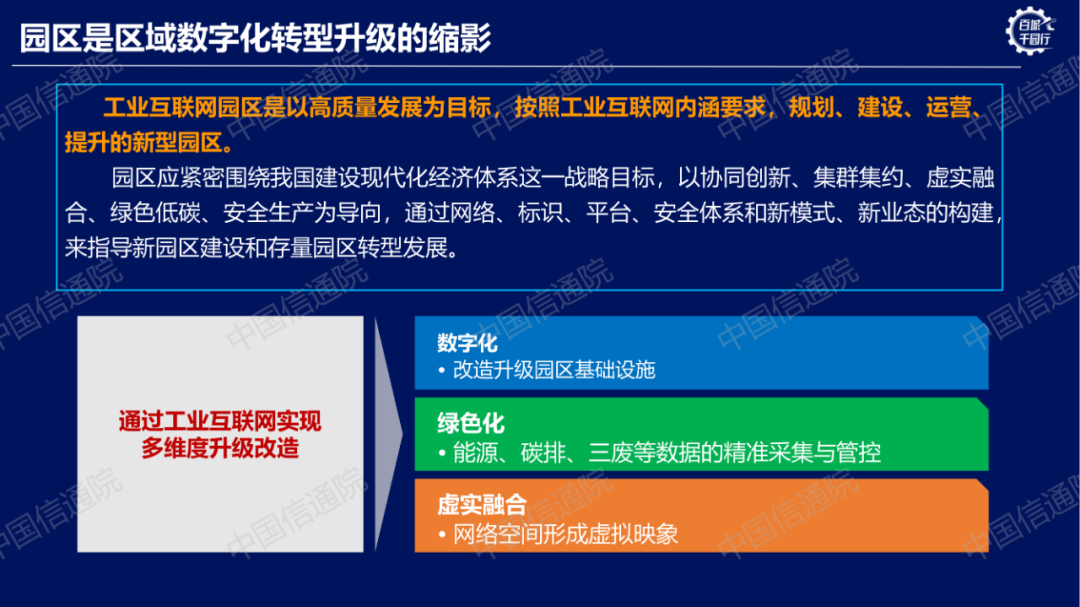 工業(yè)互聯(lián)網(wǎng)園區(qū)是以高質(zhì)量發(fā)展為目標(biāo),按照工業(yè)互聯(lián)網(wǎng)內(nèi)涵要求,規(guī)劃、建設(shè)、運營、提升的新型園區(qū)。園區(qū)應(yīng)緊密圍繞我國建設(shè)現(xiàn)代化經(jīng)濟體系這一戰(zhàn)略目標(biāo),以協(xié)同創(chuàng)新、集群集約、虛實融合、綠色低碳、安全生產(chǎn)為導(dǎo)向,通過網(wǎng)絡(luò)、標(biāo)識、平臺、安全體系和新模式、新業(yè)態(tài)的構(gòu)建,來指導(dǎo)新園區(qū)建設(shè)和存量園區(qū)轉(zhuǎn)型發(fā)展。