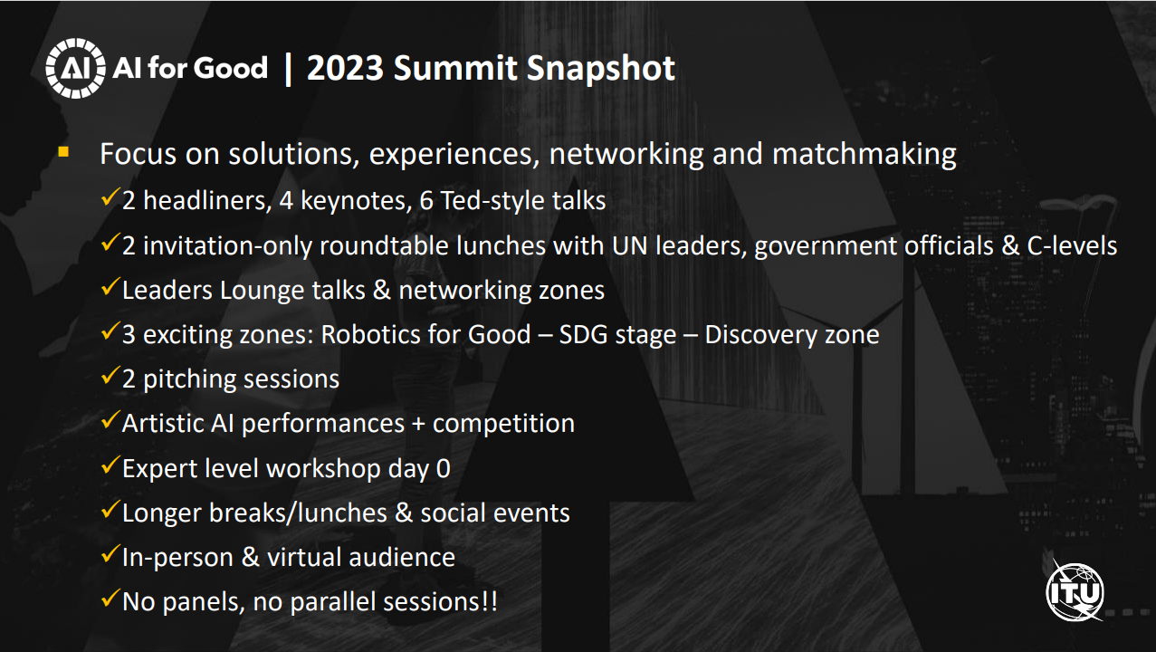 AI for Good全球峰會(huì)于2017年在日內(nèi)瓦首次舉辦,即受到業(yè)界廣泛關(guān)注。歷次峰會(huì)匯聚了來自政府、企業(yè)和學(xué)術(shù)團(tuán)體的眾多專家代表,曾邀請(qǐng)到AI三巨頭之一Yoshua Bengio作為演講嘉賓,參與企業(yè)包括微軟、亞馬遜、臉書、谷歌等行業(yè)巨頭。本次峰會(huì)上,將對(duì)氣候變化與雙碳、ChatGPT、醫(yī)療、制造業(yè)、生態(tài)系統(tǒng)、通信網(wǎng)絡(luò)、可信AI、AI驅(qū)動(dòng)未來經(jīng)濟(jì)及基于云的AI服務(wù)等主題領(lǐng)域進(jìn)行學(xué)術(shù)研討,為學(xué)術(shù)界提供技術(shù)交流,為產(chǎn)業(yè)界提供了解前沿技術(shù)的平臺(tái)。