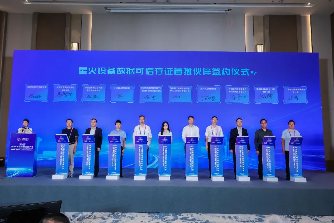 星火設備數據可信存證首批簽約儀式星火設備數據可信存證首批伙伴簽約儀式上,高琦、信通院工業互聯網創新中心(廣東)有限公司副總經理呂帥分別與中國信通院泰爾系統實驗室基礎產品與設施部主任王晨、廣東省互聯網協會秘書長傅強、汕頭市互聯網協會副會長洪煜、中國聯合網絡通信有限公司汕頭市分公司總經理朱翔、中電科普天科技股份有限公司5G事業部總經理孟新予、集商網絡科技(上海)有限公司華南區總裁游文增、科達制造股份有限公司數字工廠事業部總經理李慶民、廣東新明珠陶瓷集團有限公司技術總監李萍共8家單位代表進行三方協議現場簽約,未來,希望通過星火設備數據可信存證,構建ICT廠商、ICT采購方雙方數據共享、可信平臺,重塑ICT行業規范,進而使ICT行業以一個更健康的步伐向前邁進。