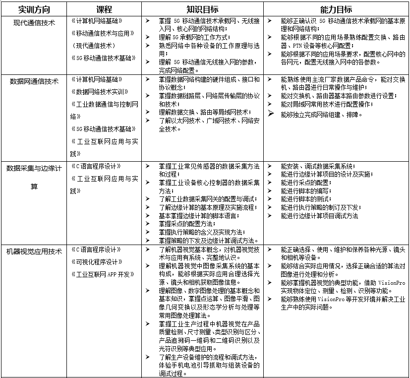 1、校內低年級學生專業(yè)化培養(yǎng)根據“工業(yè)互聯(lián)網技術”專業(yè)人才培養(yǎng)方案,以專業(yè)基礎知識、技術、技能為主,培養(yǎng)具有扎實基礎與素養(yǎng)的專業(yè)人才。2、校內高年級學生定向化培養(yǎng)根據當前及預期就業(yè)需求,以熱門就業(yè)崗位所需技能為主,培訓學生入職即上崗的專業(yè)技能。3、企業(yè)員工訂單式培養(yǎng)針對工業(yè)互聯(lián)網相關企業(yè)自有部分員工對本專業(yè)領域或專業(yè)技術的不完全掌握,由企業(yè)自行提出需要培訓的內容,承接其培訓工作。4、社會人員項目制培養(yǎng)針對無法由企業(yè)出面組織、或本人有意愿進入工業(yè)互聯(lián)網領域的散裝社會人員,制定適合不同層次、不同崗位的實訓項目,吸引其參加培訓。5、國際化人才培養(yǎng)針對本校外籍留學生,以專業(yè)基礎知識與技能為主,結合其所在國家工業(yè)互聯(lián)網發(fā)展水平,設計實訓項目。6、“1+X”技能證書培訓與認證針對具有拿證需求的人員,根據技能證書要求,進行培訓及考核。7、線上培訓課程輻射其他地區(qū)整合蘇州本地的工業(yè)互聯(lián)網產業(yè)發(fā)展的經驗和技術積累,將其中具有代表性的內容做成培訓內容,通過線上課程,傳播到其他城市和地區(qū),為工業(yè)互聯(lián)網技術的全面發(fā)展和普及做貢獻。