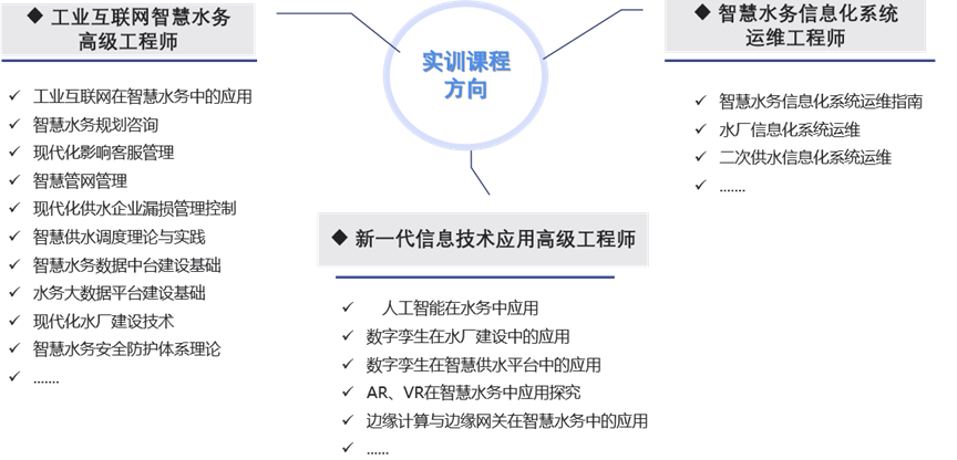 面對行業(yè)人才需求與培養(yǎng),基地主要開展三大方向高級工程師的實訓(xùn):工業(yè)互聯(lián)網(wǎng)智慧水務(wù)高級工程師、新一代信息技術(shù)應(yīng)用高級工程師、智慧水務(wù)信息化系統(tǒng)運維工程師。
