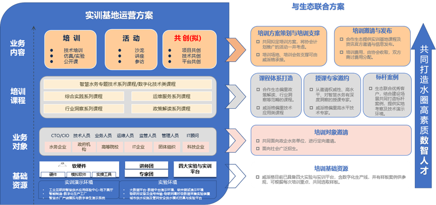 (3)業(yè)界領(lǐng)先,共創(chuàng)服務(wù)基地由智慧水務(wù)領(lǐng)軍的技術(shù)開發(fā)方牽頭建設(shè),范圍涵蓋從源頭到龍頭全流程全場景數(shù)字化技術(shù)相關(guān)的軟硬件產(chǎn)品和解決方案,在全國有落地標(biāo)桿案例,全鏈閉環(huán)的體系化課程設(shè)計,提供實訓(xùn)一條龍服務(wù),含人才實訓(xùn)、實地考察、講座沙龍、政策宣貫、標(biāo)桿參觀等。