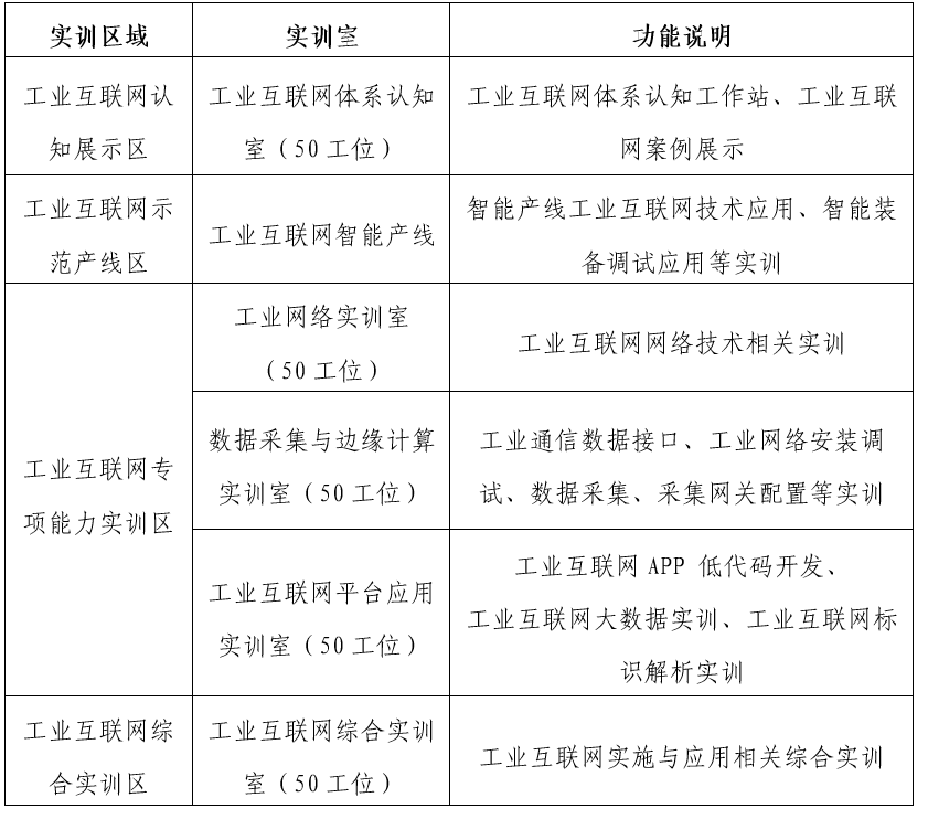 工業(yè)互聯(lián)網(wǎng)專項(xiàng)能力實(shí)訓(xùn)區(qū)域:工業(yè)互聯(lián)網(wǎng)專項(xiàng)能力實(shí)訓(xùn)區(qū)將規(guī)劃有工業(yè)網(wǎng)絡(luò)實(shí)訓(xùn)室、數(shù)據(jù)采集與邊緣計(jì)算實(shí)訓(xùn)室和工業(yè)互聯(lián)網(wǎng)平臺應(yīng)用實(shí)訓(xùn)室等實(shí)訓(xùn)環(huán)境,基于技術(shù)領(lǐng)域視角,覆蓋了工業(yè)互聯(lián)網(wǎng)技術(shù)領(lǐng)域的感知控制層、網(wǎng)絡(luò)層、平臺層、應(yīng)用層的實(shí)訓(xùn)教學(xué),能夠讓學(xué)生基本掌握工業(yè)互聯(lián)網(wǎng)平臺實(shí)施部署、運(yùn)營維護(hù)、技術(shù)應(yīng)用等專項(xiàng)技術(shù)應(yīng)用能力。