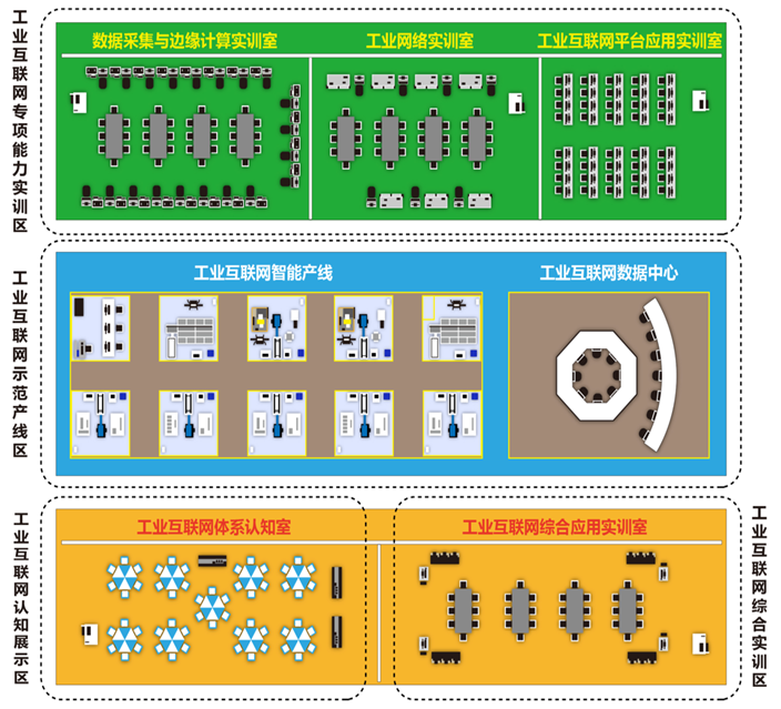 工業(yè)互聯(lián)網(wǎng)綜合實(shí)訓(xùn)區(qū)域:工業(yè)互聯(lián)網(wǎng)綜合實(shí)訓(xùn)區(qū)將實(shí)現(xiàn)典型工業(yè)產(chǎn)線的自動化控制、數(shù)據(jù)采集與應(yīng)用、定制化生產(chǎn)、云邊協(xié)同制造等場景,支持工業(yè)互聯(lián)網(wǎng)綜合實(shí)訓(xùn)教學(xué),讓學(xué)生基本具備工業(yè)互聯(lián)網(wǎng)實(shí)施與應(yīng)用的綜合能力。