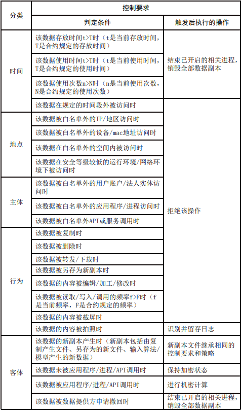 控制要求描述了數據提供方對數據使用方提出的數據使用方式的限制,控制要求主要分為以下五類。