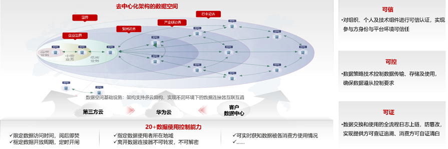 數(shù)據(jù)空間作為目前為止解決數(shù)據(jù)可信流通最合適的解決方案之一,結(jié)合華為實(shí)踐,可以將其理解為實(shí)現(xiàn)數(shù)據(jù)跨主體,跨邊界流通的“可信、可控、可證”的解決方案: