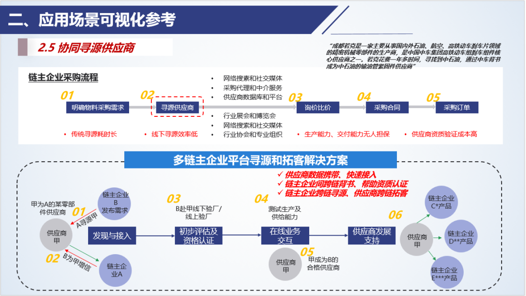 以上針對供應(yīng)商全生命周期管理的“客戶旅程圖”框架強調(diào)了從尋源到長期合作的完整客戶旅程,通過提供高效的在線業(yè)務(wù)交互工具、供應(yīng)商發(fā)展支持、以及跨行業(yè)拓展的增信和背書,鏈主企業(yè)可以吸引并維護中小企業(yè)供應(yīng)商,同時提升自己的供應(yīng)鏈競爭力和創(chuàng)新能力。