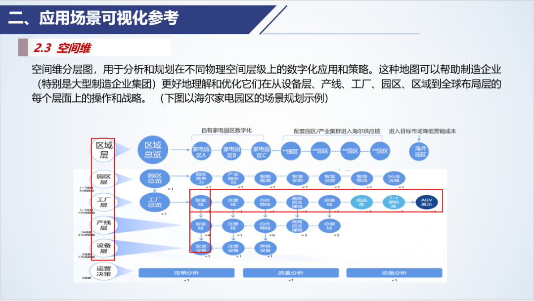 空間維分層圖,即空間維度的應(yīng)用場景地圖,用于分析和規(guī)劃在不同物理空間層級上的數(shù)字化應(yīng)用和策略。這種地圖可以幫助制造企業(yè)(特別是大型制造企業(yè)集團)更好地理解和優(yōu)化它們在從設(shè)備層、產(chǎn)線、工廠、園區(qū)、區(qū)域到全球布局層的每個層面上的操作和戰(zhàn)略。