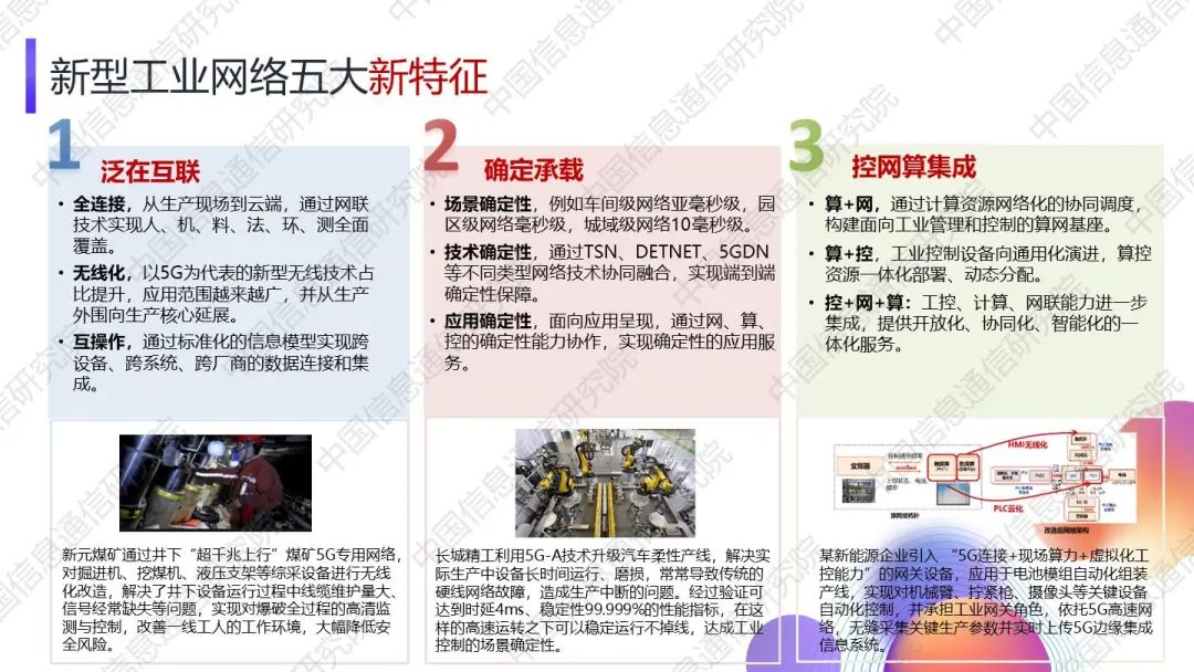 湯立波指出,新型工業(yè)網(wǎng)絡(luò)面向技術(shù)創(chuàng)新推動(dòng)、應(yīng)用需求牽引、生態(tài)重構(gòu)加速的時(shí)代需求,突出了“泛在互聯(lián)、確定承載、控網(wǎng)算集成、開(kāi)放智能、安全可控”的新型工業(yè)網(wǎng)絡(luò)五大創(chuàng)新特征。湯立波強(qiáng)調(diào),新型工業(yè)網(wǎng)絡(luò)采用“3X3”矩陣架構(gòu):從能力上,網(wǎng)聯(lián)和算力能力從控制體系分離,形成“控-網(wǎng)-算”三要素協(xié)同的新架構(gòu);從層級(jí)上,將以端-邊-云為主體形成更為扁平化的三層級(jí)互聯(lián),即工控三層、網(wǎng)聯(lián)三域、算力三級(jí)。湯立波表示,工控三層包括現(xiàn)場(chǎng)執(zhí)行、邊緣管控和中心決策,通過(guò)扁平開(kāi)放、分層管控實(shí)現(xiàn)智能控制和管理。網(wǎng)聯(lián)三域包括現(xiàn)場(chǎng)接入網(wǎng)、邊緣匯聚網(wǎng)和中心骨干網(wǎng),通過(guò)一網(wǎng)到底、分域服務(wù)實(shí)現(xiàn)確定可靠網(wǎng)聯(lián)。算力三級(jí)包括現(xiàn)場(chǎng)算力、邊緣算力和中心算力,通過(guò)算力覆蓋、分級(jí)賦能實(shí)現(xiàn)智能上下貫通。