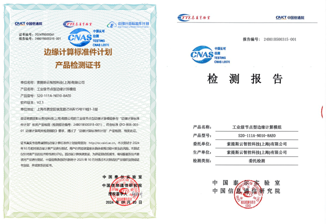 經(jīng)過中國信息通信研究院集中測試,索提斯云智控科技(上海)有限公司自主研發(fā)的工業(yè)級節(jié)點型邊緣計算模組S20順利通過“邊緣計算標(biāo)準(zhǔn)件計劃”產(chǎn)品測試,并已在多個行業(yè)領(lǐng)域?qū)崿F(xiàn)工廠級部署及穩(wěn)定運行,助力各行各業(yè)打通IT與OT連接,賦能企業(yè)數(shù)字化轉(zhuǎn)型。