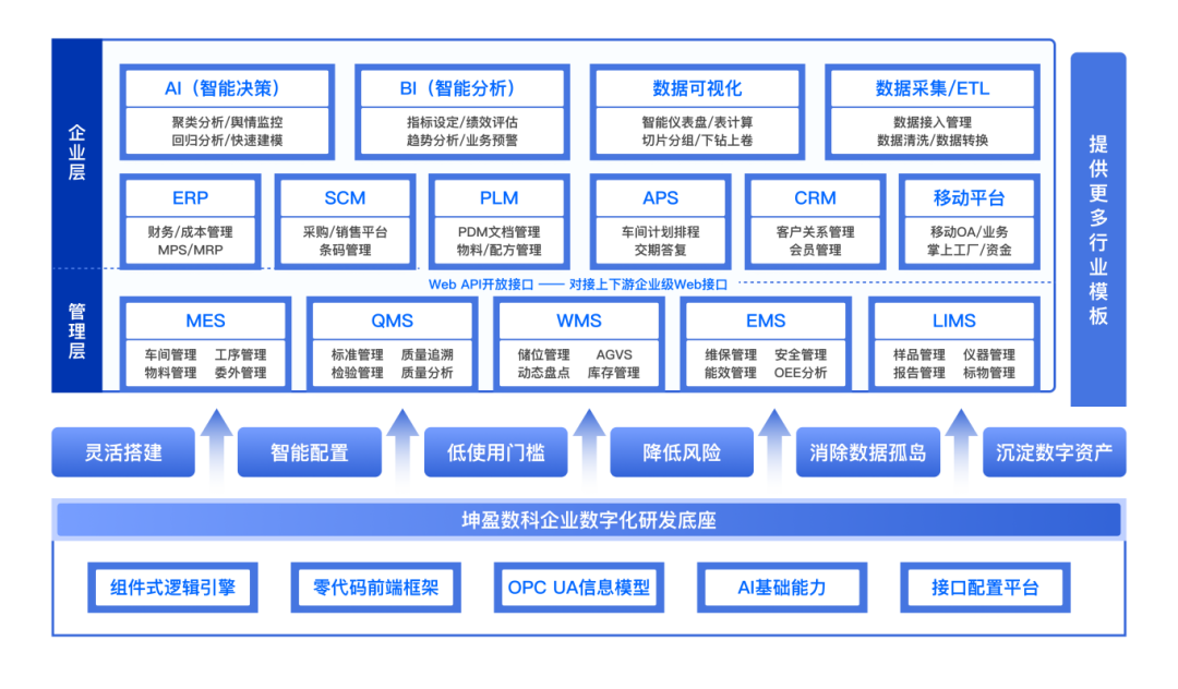 企業(yè)數(shù)字化研發(fā)底座以信息模型概念為基礎(chǔ),搭載坤盈數(shù)科自主研發(fā)的“組件式邏輯引擎”和“零代碼前端框架”等技術(shù)集,面向企業(yè)數(shù)字化研發(fā)過(guò)程中面臨的功能研發(fā)、部署、迭代、多系統(tǒng)集成、企業(yè)數(shù)據(jù)挖掘、AI賦能等課題給出了一系列研發(fā)工具。坤盈數(shù)科的宗旨是“只需要一個(gè)平臺(tái),就可以解決企業(yè)數(shù)字化建設(shè)的所有問(wèn)題。通過(guò)使用企業(yè)數(shù)字化研發(fā)底座,企業(yè)能夠由非IT技術(shù)人員完成數(shù)字化應(yīng)用的搭建,并真正的實(shí)現(xiàn)“敏捷研發(fā)”,縮短從需求到功能落地之間的步驟,降低數(shù)字化項(xiàng)目風(fēng)險(xiǎn),大大縮減項(xiàng)目研發(fā)成本和周期,使企業(yè)數(shù)字化的落地實(shí)施更加平滑。