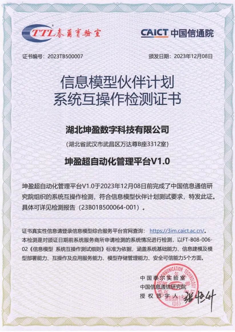 湖北坤盈數(shù)字科技有限公司(以下簡(jiǎn)稱(chēng)“坤盈數(shù)科”)是工業(yè)互聯(lián)網(wǎng)產(chǎn)業(yè)聯(lián)盟信息模型伙伴計(jì)劃伙伴單位,自主研發(fā)的坤盈超自動(dòng)化管理平臺(tái)V1.0是基于坤盈數(shù)科企業(yè)數(shù)字化研發(fā)底座衍生出的綜合管理平臺(tái),該平臺(tái)完成了中國(guó)信息通信研究院組織的系統(tǒng)互操作檢測(cè)。