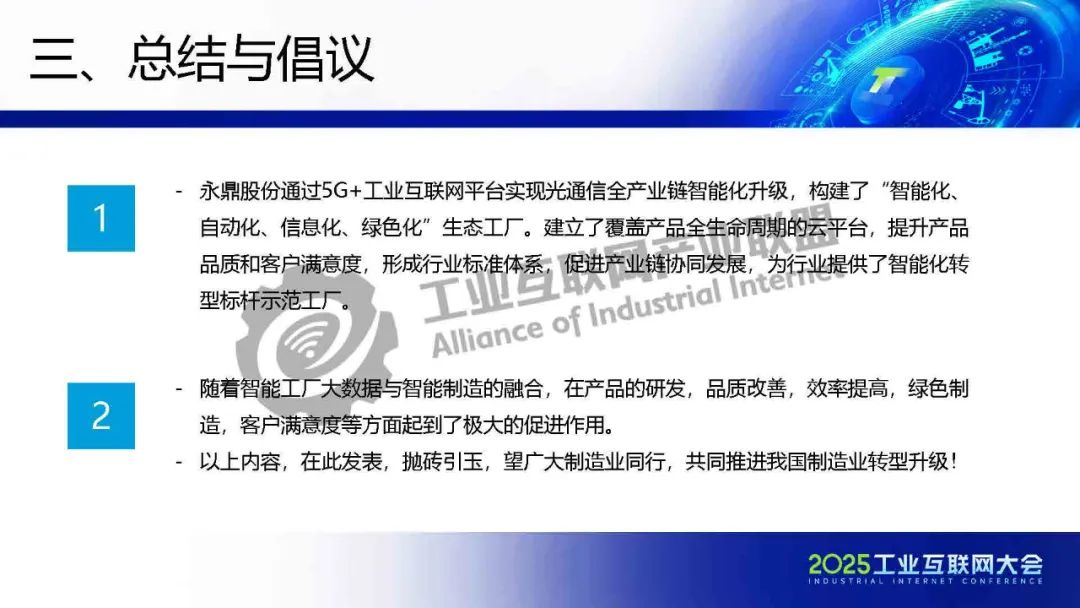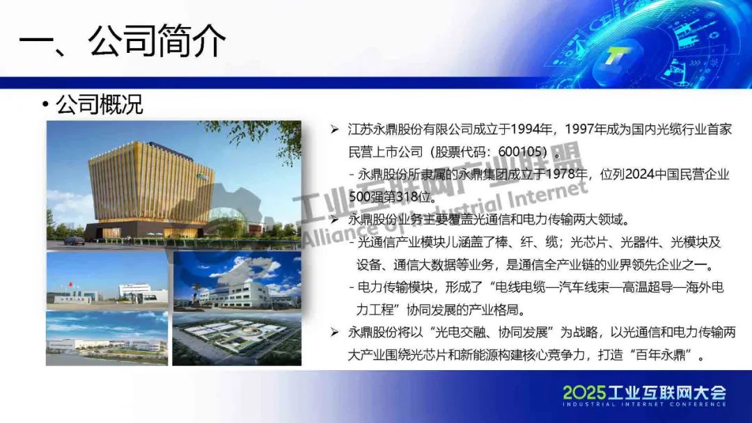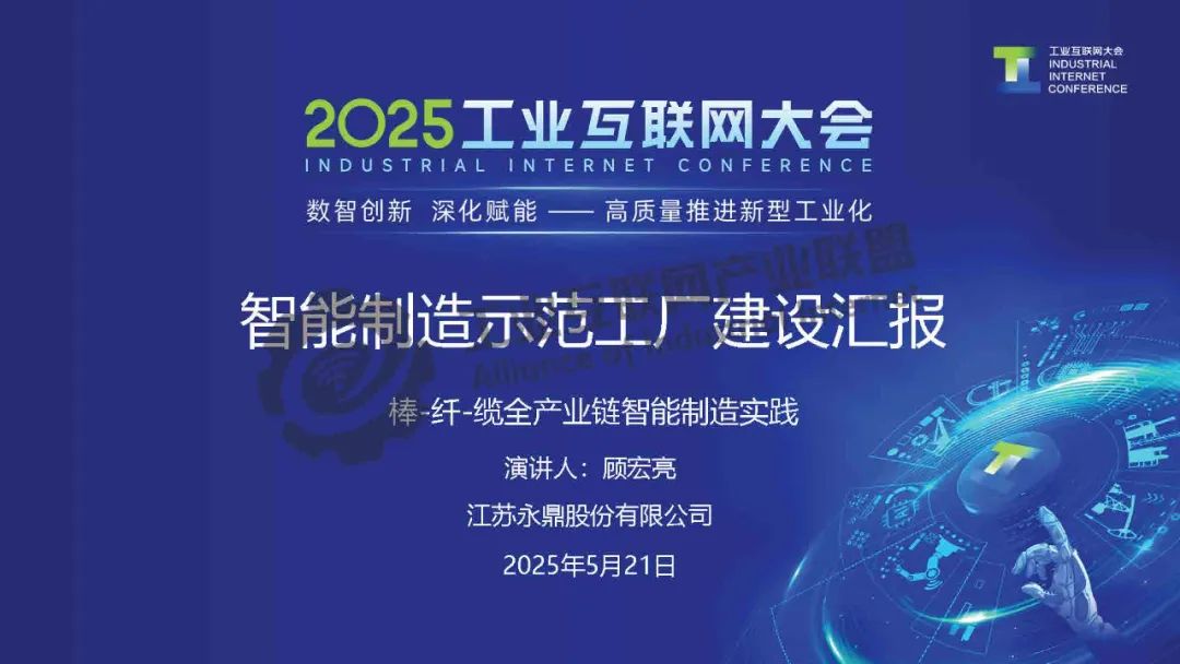 5月21日,在2025工業(yè)互聯(lián)網(wǎng)大會“工業(yè)互聯(lián)網(wǎng)數(shù)智融合創(chuàng)新發(fā)展專題活動”上,永鼎股份光棒、光纖公司副總經(jīng)理顧宏亮發(fā)表了《智能制造示范工廠建設(shè)匯報:棒纖纜全產(chǎn)業(yè)鏈智能制造實踐》的主題演講。