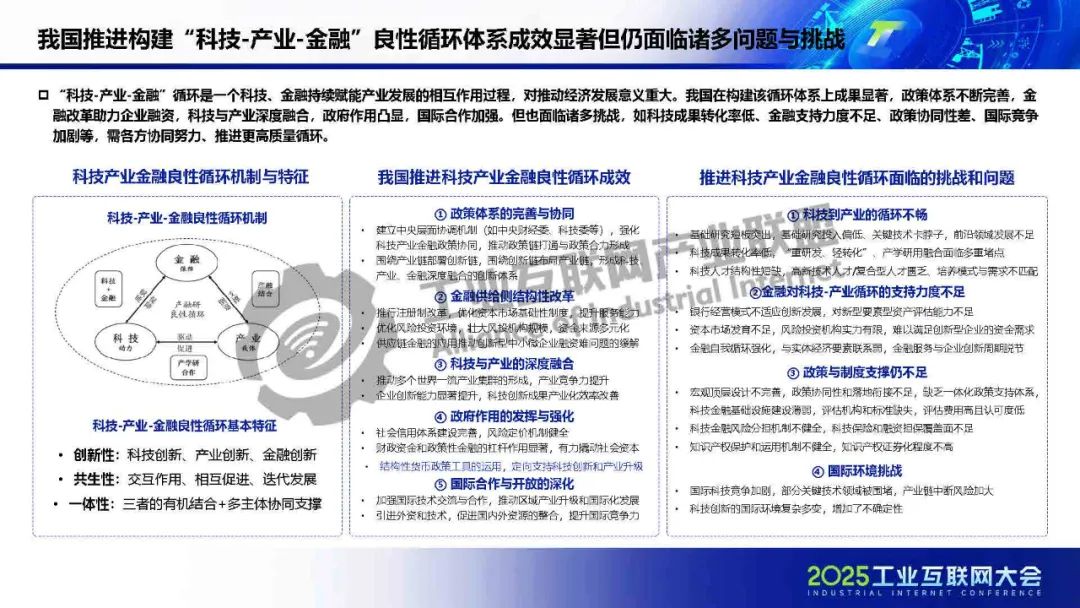 廖文凱介紹,我國工業互聯網由起步建設階段邁入高質量發展新階段,政策體系漸趨完善、技術融合應用持續深化、行業應用成效凸顯。而工業互聯網的高質量發展將進一步通過區域集群化協同與行業深度垂直化,打通科技、金融、產業的互動壁壘,構建“數據-資本-價值”三位一體的循環體系,推動實現“科技-金融-產業”良性循環。