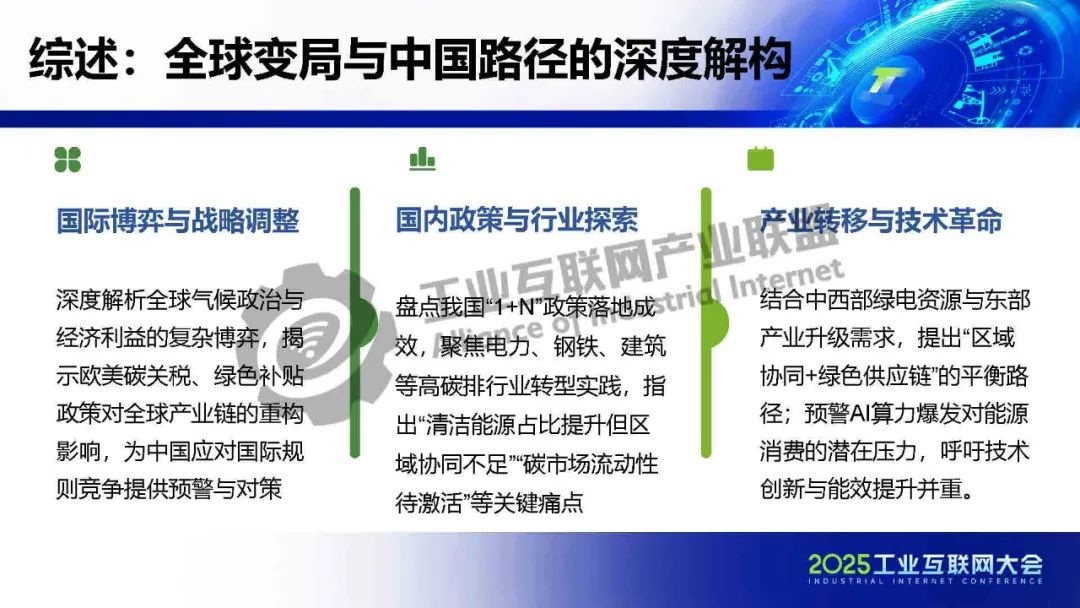 全球變局與中國路徑的深度解構(gòu):一是深度解析全球氣候政治與經(jīng)濟(jì)利益的復(fù)雜博弈,揭示歐美碳關(guān)稅、綠色補(bǔ)貼政策對全球產(chǎn)業(yè)鏈的重構(gòu)影響,為中國應(yīng)對國際規(guī)則競爭提供預(yù)警與對策;二是盤點我國“1+N”政策落地成效,聚焦電力、鋼鐵、建筑等高碳排行業(yè)轉(zhuǎn)型實踐,指出“清潔能源占比提升但區(qū)域協(xié)同不足”“碳市場流動性待激活”等關(guān)鍵痛點;三是結(jié)合中西部綠電資源與東部產(chǎn)業(yè)升級需求,提出“區(qū)域協(xié)同+綠色供應(yīng)鏈”的平衡路徑;預(yù)警AI算力爆發(fā)對能源消費(fèi)的潛在壓力,呼吁技術(shù)創(chuàng)新與能效提升并重。