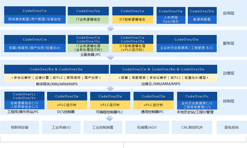CodeOne工控軟件平臺面向不同設備廠商大/中/小型可編程邏輯控制器(PLC)和IPC提供統一無代碼組態(tài)編程環(huán)境、無差別編譯器與標準化運行時,軟件功能覆蓋工控系統的控制層、邊緣層、服務層和應用層(見下圖),支持“數據采集-智能處理-應用開發(fā)-反向控制”全鏈條閉環(huán)。控制層可集成軟PLC運行時內核,支持多種異構PLC/IPC硬件;邊緣層可支持EtherCAT、Profibus、OPC UA、MQTT等多種協議,集成邊緣計算、斷網續(xù)傳、國密算法;服務層集成容器、微服務技術和輕量化大語言模型,支持大容量數據存儲、周期定時/事件觸發(fā)/接口交互等多種類型的復雜邏輯編排處理服務;應用層集成支持IT與OT融合的PLC無代碼組態(tài)編程工具,支持端邊云協同的運動控制和PLC多機集群分布式控制等多種應用。